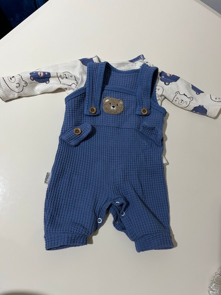 Örgü dokulu mavi bebek erkek tulum, uzun kollu ve bisiklet yaka. Önünde ayıcık detaylı, çıtçıtlı kolay giyilir model. 0-2 ay arası kullanılabilir. Hiçbir sorunu yoktur.