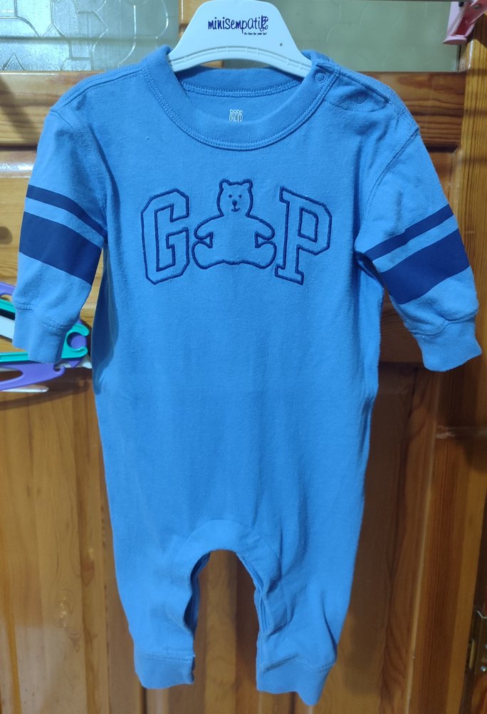 Orijinal GAP tulumu(resimlerde fiş bulunuyor) 3-6 ay lacivert bebeklerime küçük olduğu için satıyorum,hiç bir defosu yok,çıt çıtlar hepsi sağlam çalışıyor.elimde 2 tane aynı tulum var.Fiyat tek ürün içindir Mavi renkli, uzun kollu ve yuvarlak yakalı erkek bebek tulumu, yumuşak örme kumaştan ve renkli baskılı desenlerle tasarlanmıştır.