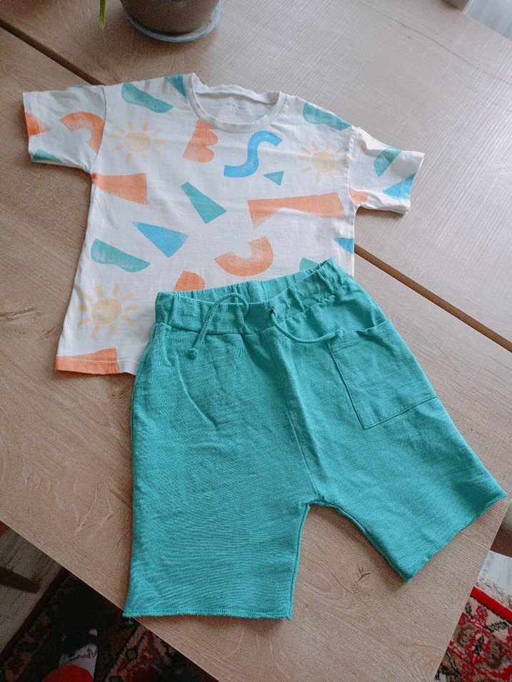 Kısa kollu, baskılı tişört ve turkuaz keten şorttan oluşan rahat ve şık erkek bebek takımı.