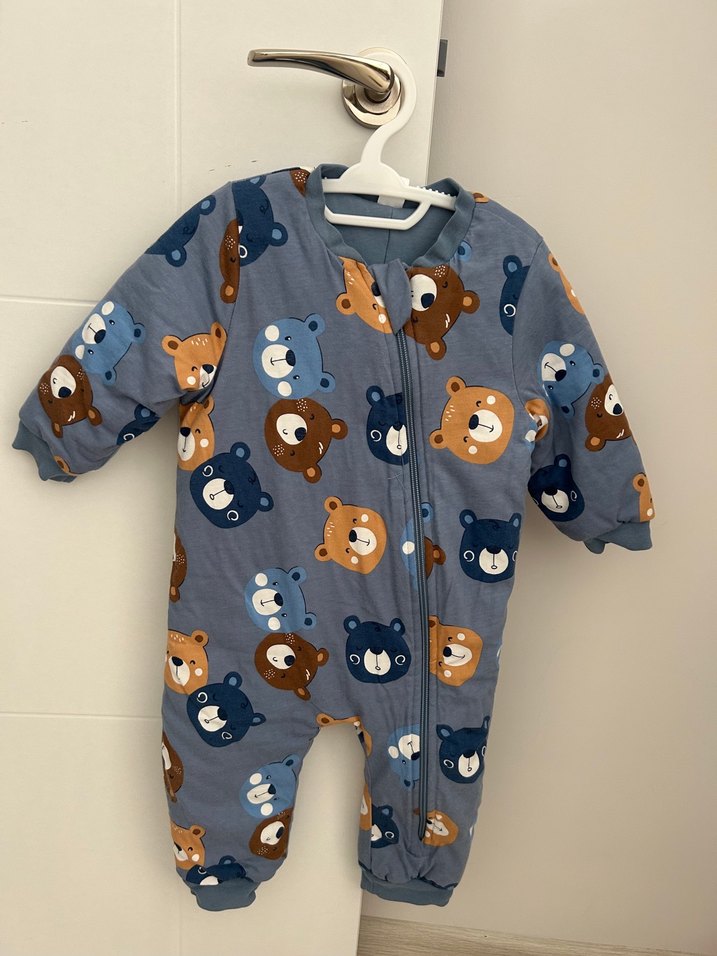 Ürün 1 kez giyildi. 12-18 ay Çok iyi durumda. Yumuşak fermuarlıve baskılı ayı desenli mavi bebek tulumu, 2.5 tog sıcak tutar.