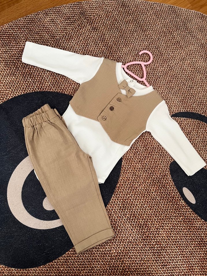 Pamuklu uzun kollu beyaz üst, kahverengi düğmeli yelek detaylı ve uyumlu pantolonlu bebek takımı.