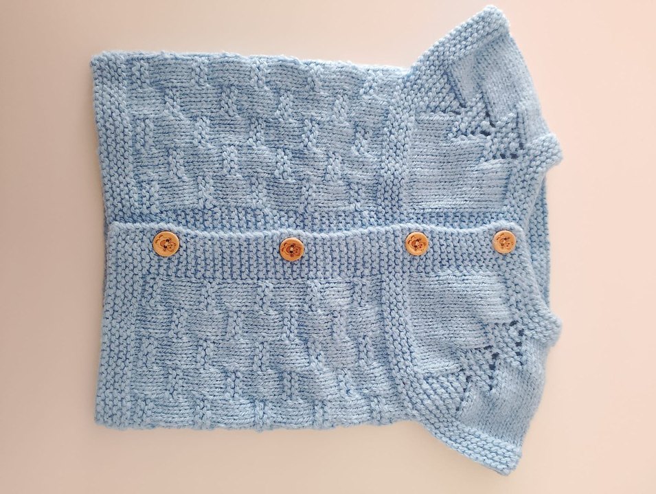 Vintage tarzda, düğmeli, regüler kesim erkek çocuk mavi triko yeleği. Yumuşak örgü 0/3 ay için uygun ölçüler fotoda mevcut. uygun fiyatlı kaliteli diğer modeller için hesabı inceleyin!