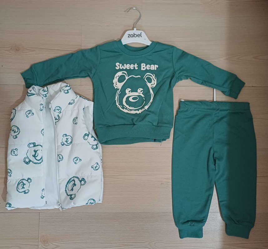 Yeşil renkli, uzun kollu, bisiklet yaka üstte ayıcık baskısı bulunan, eşleşen pantolon ve fermuarlı ayıcık desenli yelekten oluşan yumuşak polar kumaş 3'lü bebek takımı.