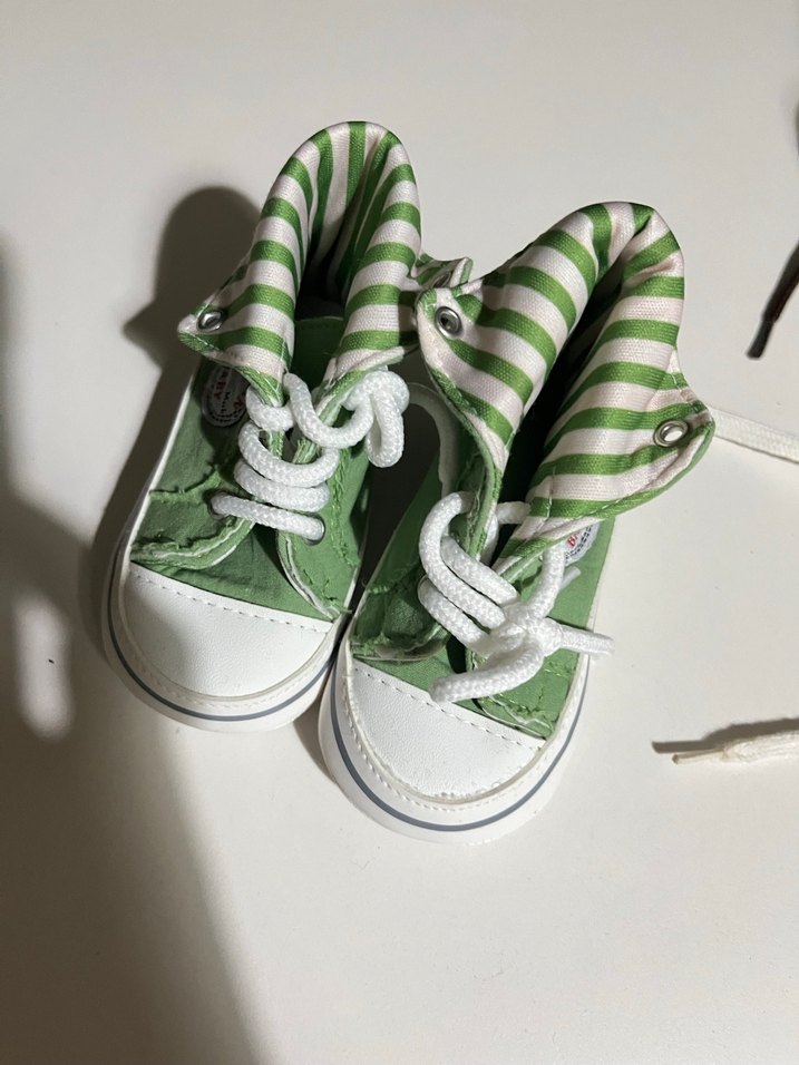 Yeşil kauçuk malzemeden, renkli çizgili desenli, cırt cırtlı erkek bebek ilk adım ayakkabısı, sokak tarzında tasarlandı.