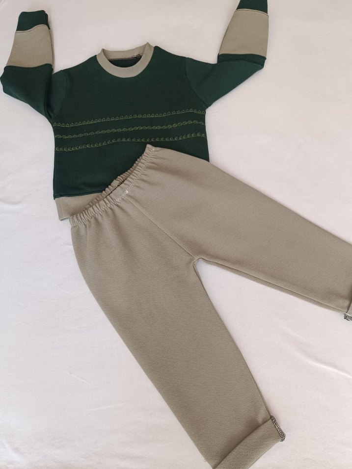 Uzun kollu, yuvarlak yakalı yeşil iki iplik sardonsuz üst ve yumuşak, sıcak gri pantolon içeren erkek bebek takım 2 yaş için uygun hiç giyilmedi sıfır ürün terziyim kendim dikiyorum