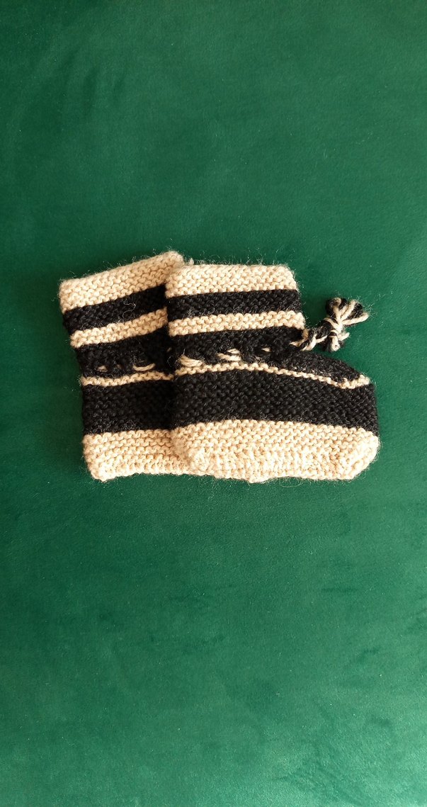 Örgü malzemeden yapılmış, zebra desenli erkek bebek patikleri. Koyu ve beyaz renklerde, bohem ve retro tarzda.