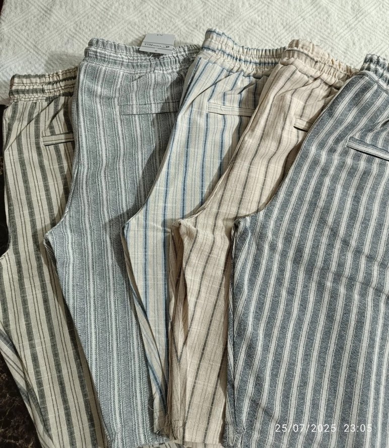 erkek keten kumaştan, renk renk çizgili ve pilili detaylara sahip, kisa, rahat kesim pantolon. Günlük kullanıma uygun tarz 1.kalite kumaş
