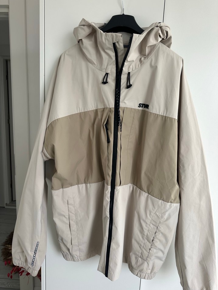 Erkekler için bej ve gri tonlarında, kapüşonlu, fermuarlı, bol kesim rüzgarlık mont. Uzun kollu ve sentetik kumaştan, dış mekan kullanımı için uygundur. ️