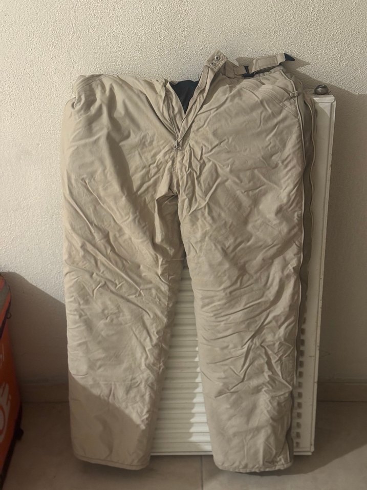 Bej renkli, kemerli, bol kesim kumaş pantolon. Midi boyda, rahat ve sokak stiline uygun, dış mekan kullanımı için ideal. Soğuk geçermez. Kayak pantolonu