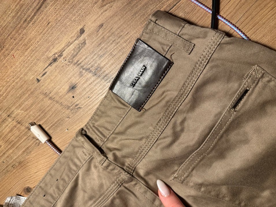 Erkekler için bej keten kumaştan, kemerli ve normal paça, desen içermeyen rahat kesim pantolon. Günlük kullanıma uygun normcore tarzda. ZARA