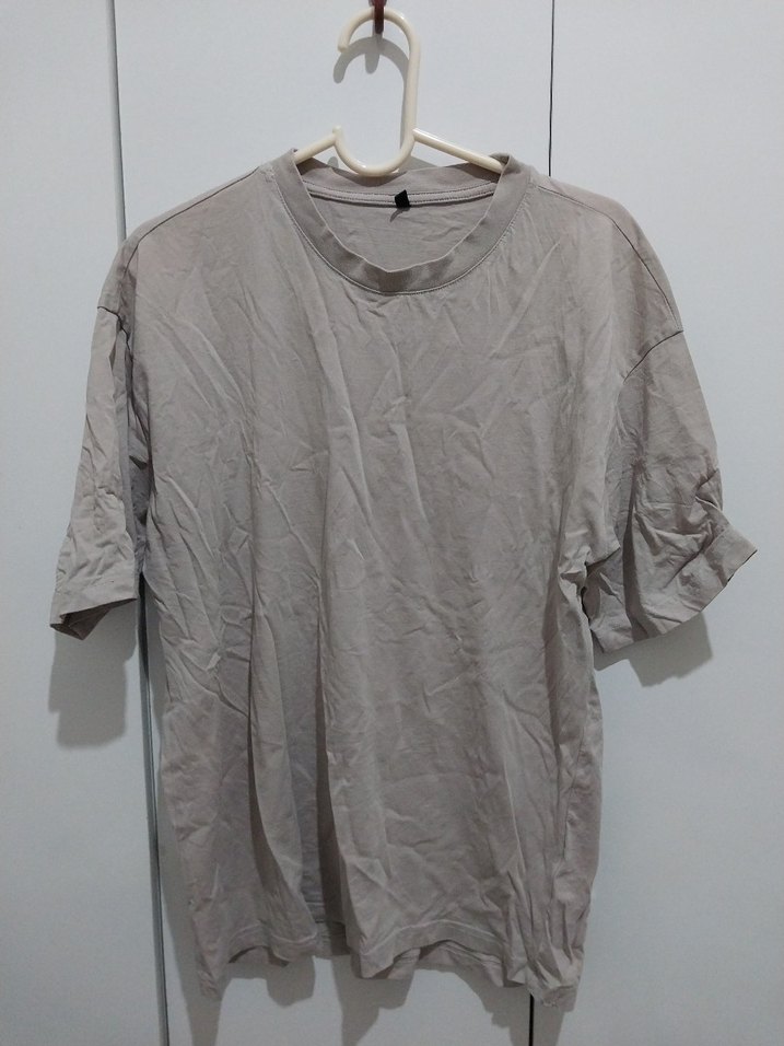 Erkekler için bej renkte, keten kumaştan yapılmış, kısa kollu ve yuvarlak yaka, bol kesim tişört. Minimalist sokak stili sunar, günlük kullanım için uygundur.