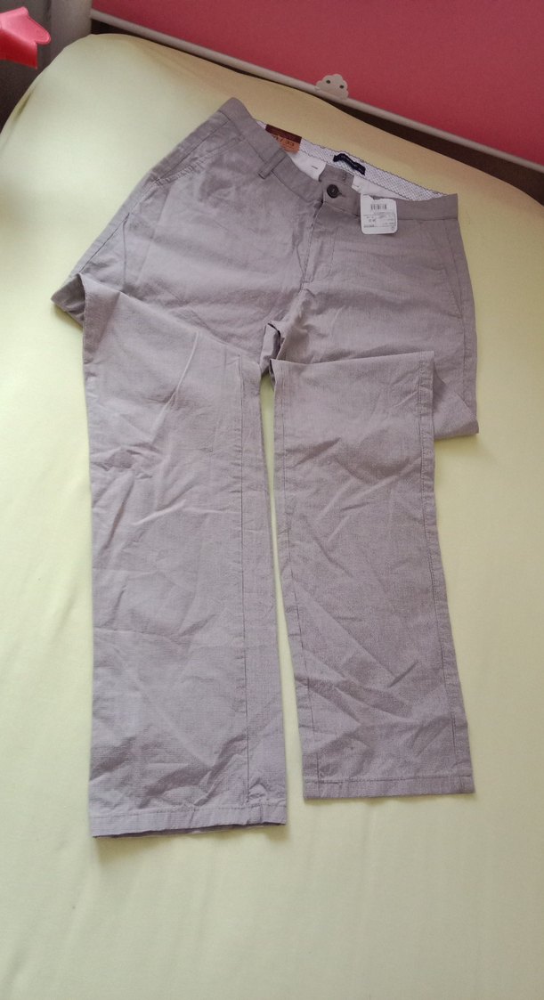 Bej keten kumaştan, rahat kesim erkek pantolon. Günlük kullanıma uygun, sade ve desen içermeyen tasarıma sahip.