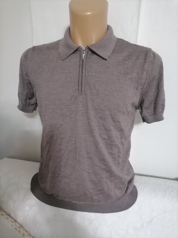 Bej renkli, kısa kollu, yakalı erkek polo tişört. Yumuşak keten kumaştan üretilmiş, önünde fermuar detaylı ve normal kesimdir.