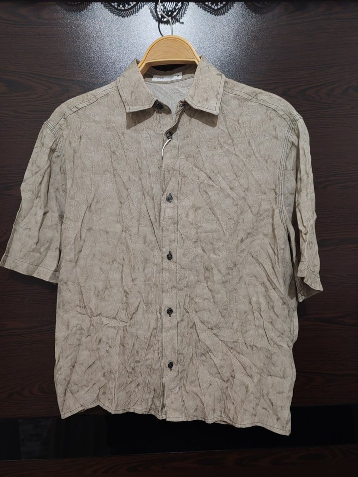 Erkekler için kısa kollu, keten kumaştan yapılmış, yakalı ve düğmeli bej ve gri tonlarında batik desenli bol kesim gömlek. Rahat sokak stili için uygun.