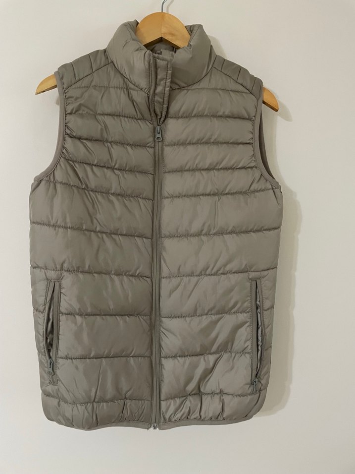 Bej rengi dik yaka önden cepli ve fermuarlı şişme yelek sadece 2 kez giyildi yenidir.İki koltuk arası 49 cm,boy 64 cm dir.