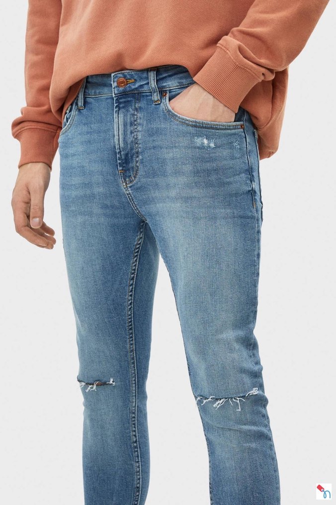 İlk görsel temsili orijinal mankeni bulamadım Erkekler için süper skinny , normal boyda kot pantolon. Yırmaç detaylı, kot mavi renkte ve desen içermeyen rahat bir model.