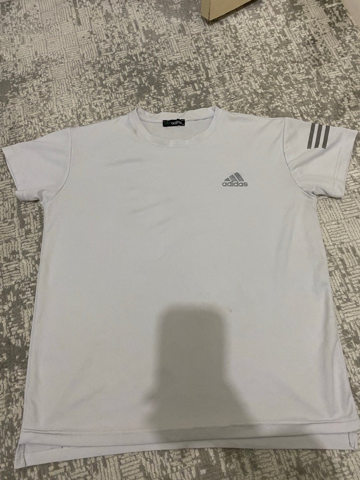 Erkekler için beyaz Adidas tişört, kısa kollu ve yuvarlak yaka. Pamuklu kumaştan üretilmiş, baskılı logo ve kollarda üç çizgi detaylı, spor ve rahat bir görünüm sunar. ⚽