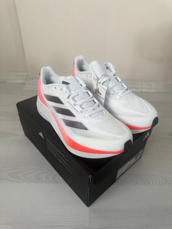 Erkekler için Adidas koşu ayakkabısı, beyaz zemin üzerine baskılı detaylar ve açık mercan tonlarıyla. Bağcıklı ve kauçuk tabanlı, spor sokak stili için uygun. ♂️