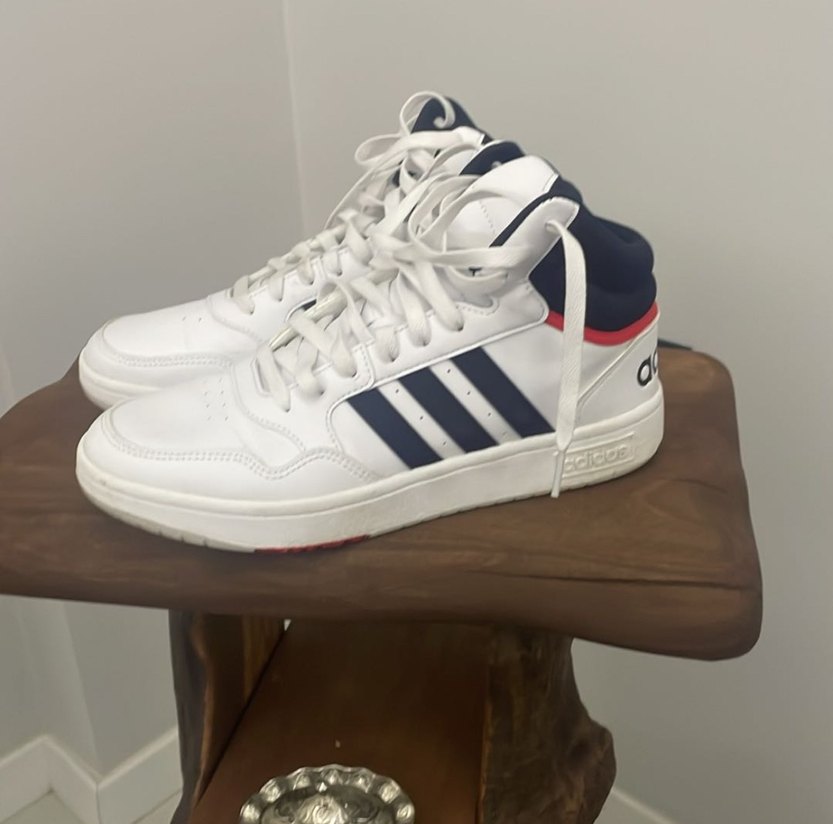 Beyaz Adidas erkek spor ayakkabısı, bağcıklı ve baskılı lacivert çizgilerle, rahat kauçuk tabanlıdır. Spor ve günlük stil için uygundur.Orjinaldir