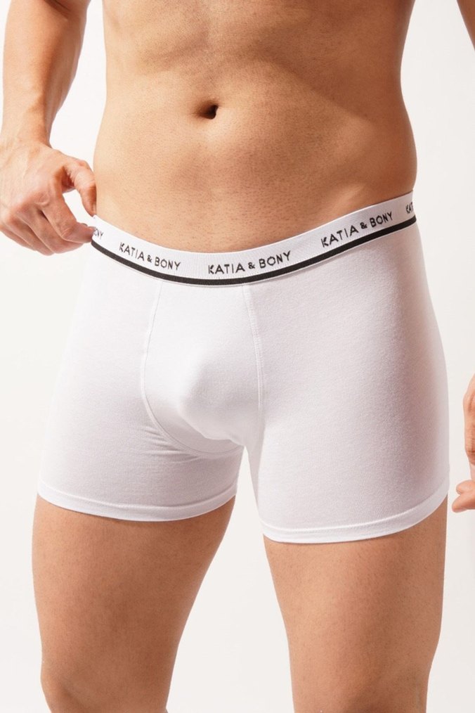 Katı beyaz, atletik kesim ve orta boy uzunlukta, Katia & Bony logolu rahat bel bantlı erkek boxer. ⚪