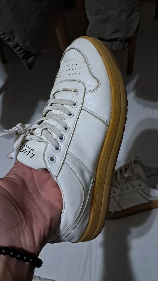 Beyaz bağcıklı erkek spor ayakkabısı, kauçuk tabanlı ve ince topuklu, günlük rahat kullanım için uygundur. Açık renkli ve desensiz tasarımıyla trend sokak stiline uyum sağlar.