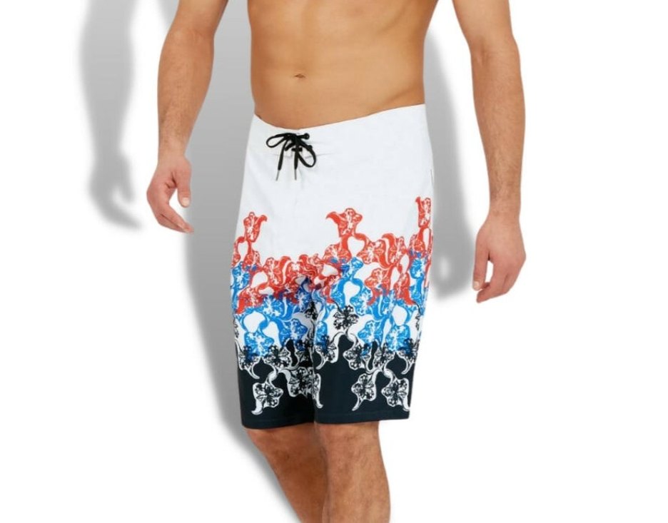 Erkekler için beyaz bağcıklı ve kemerli, gevşek kesim mini deniz şortu. Canlı kırmızı, mavi ve siyah detaylara sahip.