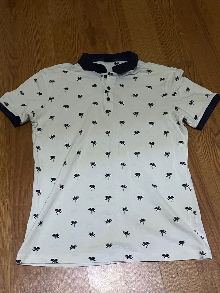 Pamuk kumaştan yapılmış, düğmeli yakalı ve kısa kollu beyaz baskılı erkek polo tişört, rahat kesimli ve günlük kullanıma uygun.