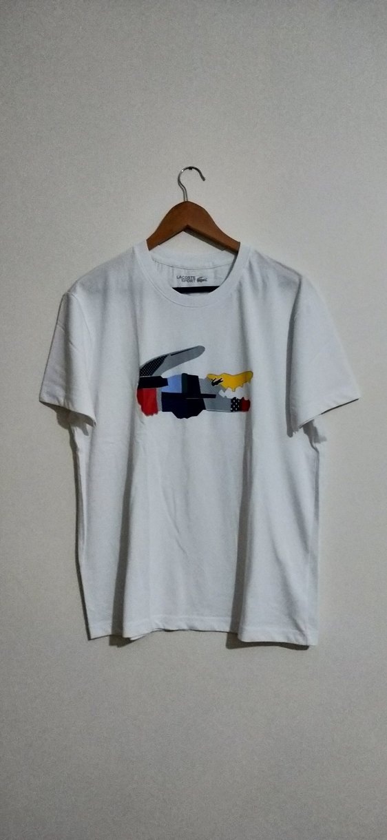 Pamuk kumaştan, kısa kollu ve bisiklet yaka erkek beyaz tişört. Renkli baskısıyla günlük sokak stili için uygun.