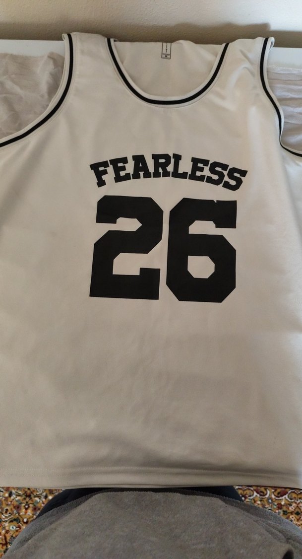 Beyaz, bol kesim, kolsuz spor atleti. Önünde 'FEARLESS 26' baskısı var. Yumuşak ve sıcak kumaştan, askısız yaka ve fermuarlı detay içerir.