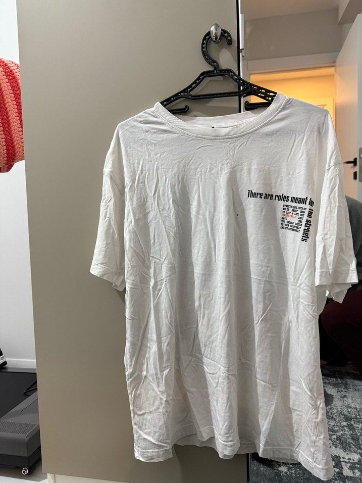 Erkekler için beyaz pamuk tişört, bol kesim, kısa kollu ve yuvarlak yaka. Gri baskılı yazılı tasarımıyla gündelik ve trend bir görünüm sunar.