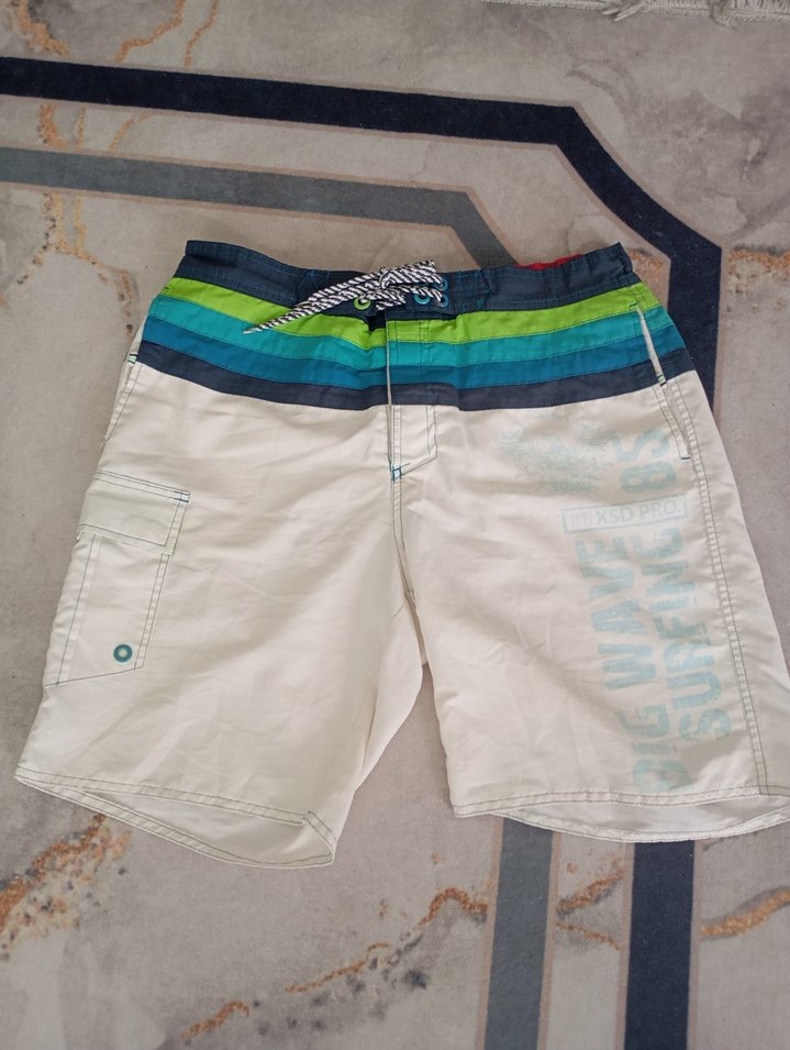 Beyaz renkli, bel bantlı ve renkli çizgili detaylı, bol kesim erkek mini şort. Yan cepli ve rahat bir görünüme sahip. Bel 45 Boy 52