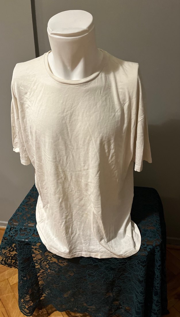 Erkekler için beyaz, bol kesim ve normal boyda minimal tasarımlı tişört. Hafif ve rahat kumaştan üretilmiştir. Arka etek bölümünde leke var yıkanması gerekiyor