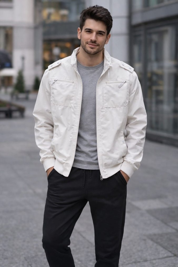 Beyaz bomber ceket, notched yaka ve uzun kollu, rahat kesim ve desensiz tasarımla günlük sokak stili için uygun. Rüzgarlık ve su geçirmiyor.