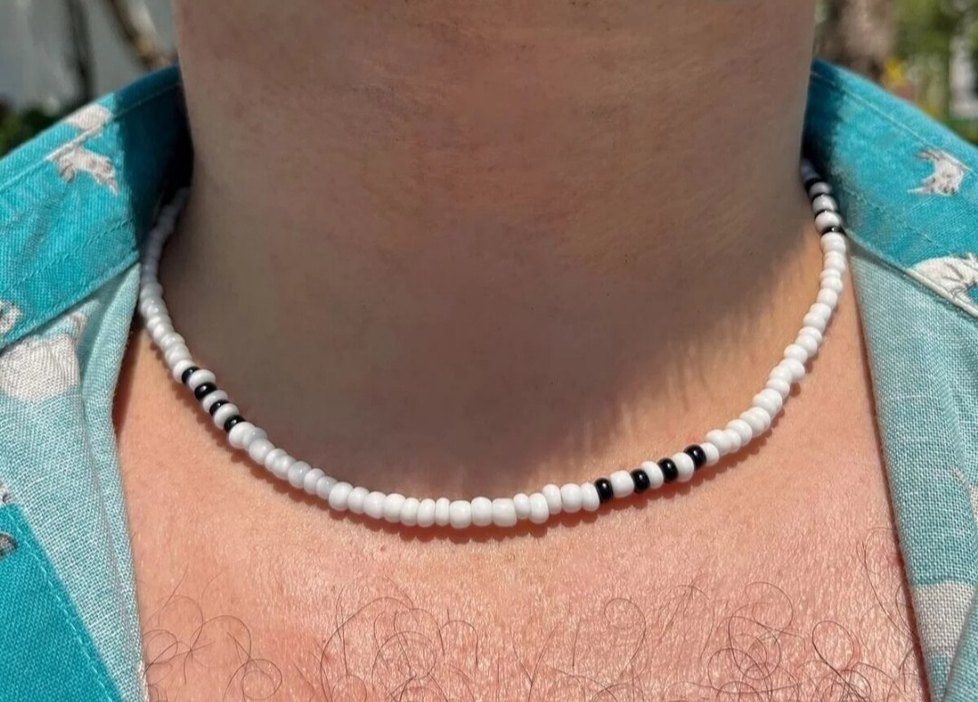 Beyaz boncuklardan oluşan, siyah-beyaz çizgili desene sahip normal uzunlukta midi erkek kolye. Minimalist ve bohem tarzda, günlük kullanıma uygun.