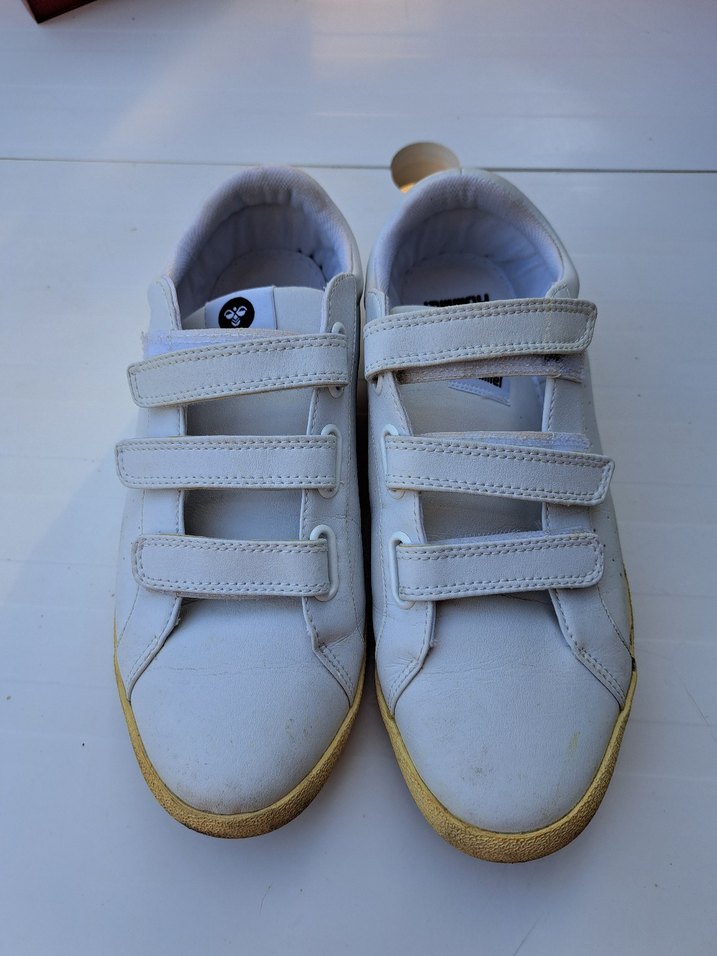 Üç cırt cırtlı beyaz erkek spor ayakkabısı, düz kauçuk tabanlıdır. Spor ve günlük sokak stiline uygun, hafif ve desensiz tasarım. az giyilmistir