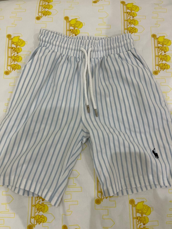 Açık beyaz pamuklu, mavi çizgili, bol kesim, pileli ve lastikli bel bağcıklı erkek şort. Plaj için uygun rahat stil. orijinal değildir!!