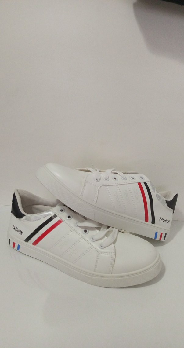 Beyaz renkte, renkli çizgili ve bağcıklı erkek spor ayakkabısı. İnce topuklu ve kauçuk tabanlı, sportif sokak stili için uygun. temudan aldık yeni kullanılmadı eşime olmadığı için satıyorum