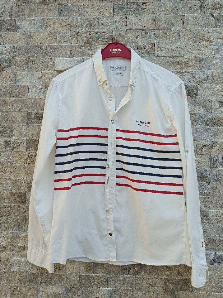 Erkekler için beyaz pamuk gömlek, uzun kollu ve çıtçıtlı. Kırmızı ve lacivert yatay çizgilerle desenli, rahat kesim, günlük sokak stili için uygun.
