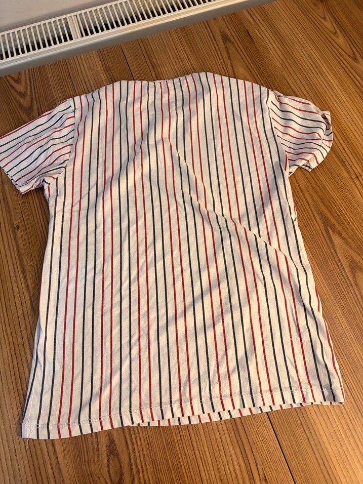 Erkek çocuk için kısa kollu, V yakalı, bol kesim gömlek. Çizgili desenli, düğmeli ve hafif sentetik kumaştan, bohem ve retro tarzda.