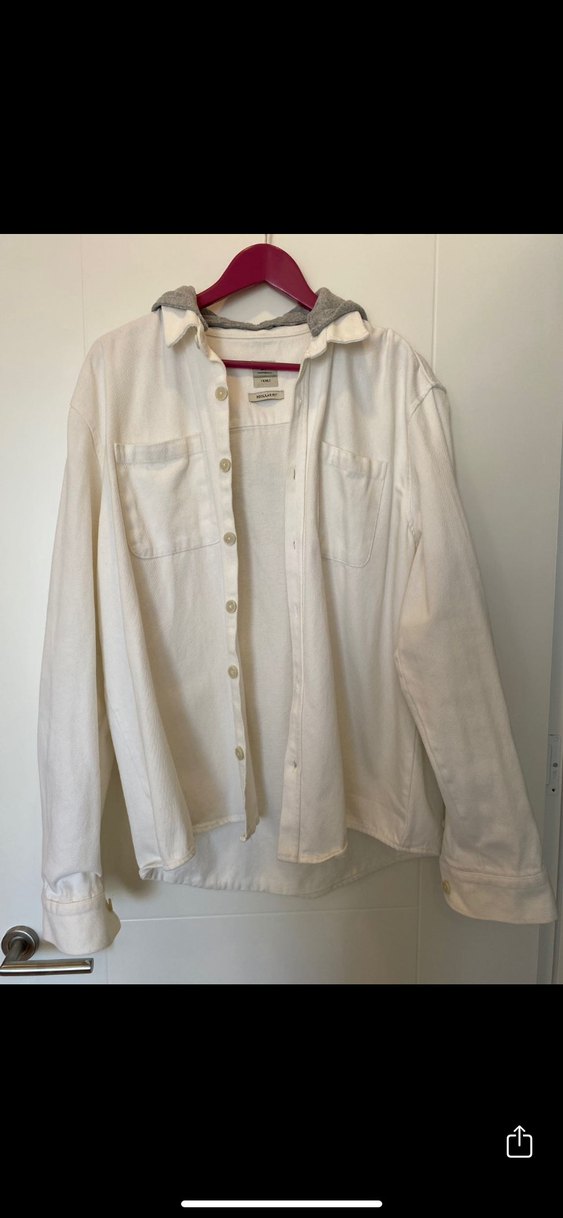 Düğmeli, uzun kollu, yakalı ve iki göğüs cepli beyaz denim gömlek. Rahat kesimiyle günlük sokak tarzına uygundur.