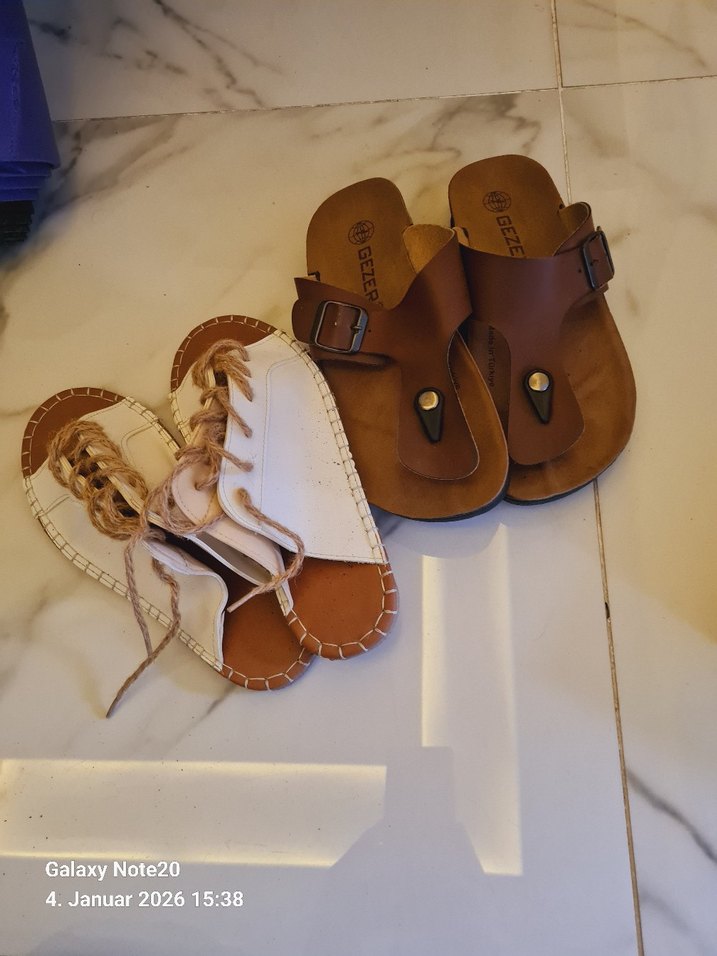 Beyaz deri erkek sandalet, tokalı kayışlı, bohem tarzında, günlük kullanım için uygun. Açık renk ve desensiz tasarım.