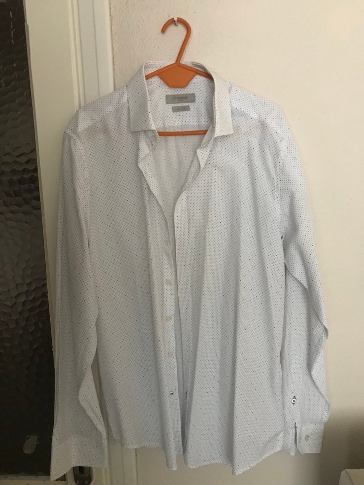 Erkekler için yakalı, uzun kollu, düğmeli beyaz pamuk gömlek. Regular kesim, minimal ve şık günlük kullanım için uygun, gri hafif noktalı desenli.