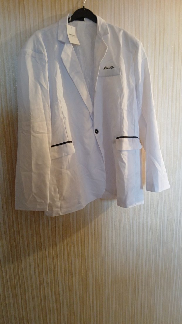 Kadınlar için beyaz keten ceket, notlu yakalı ve düğmeli. Uzun kollu, normal midi boyunda ve rahat kesim. Ceplerinde siyah şerit detayları bulunur.