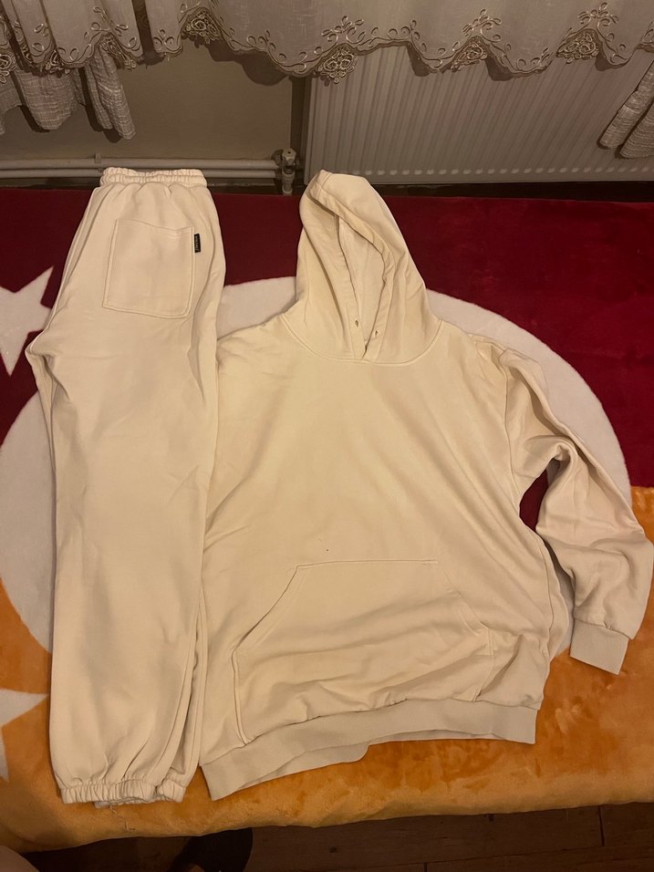Erkekler için beyaz renkli, rahat kesim ve kapüşonlu eşofman takımıdır. Yumuşak ve sıcak kumaştan üretilmiş, günlük kullanım için uygundur.