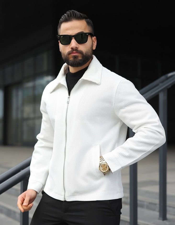 Erkek Beyaz Fermuarlı Dokulu Klasik Spor Ceket