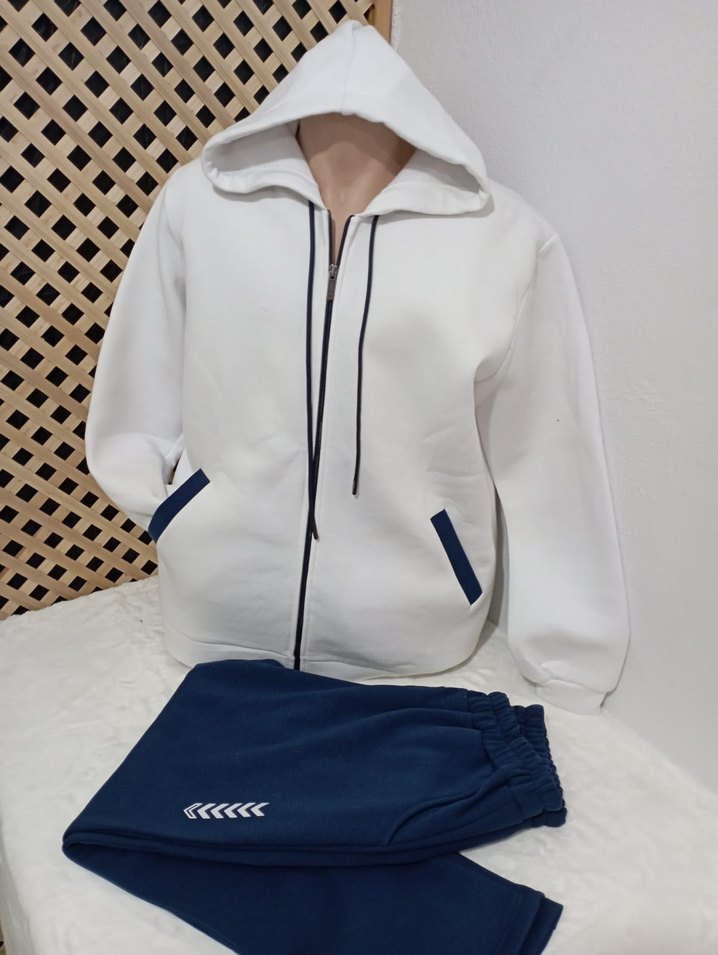 Beyaz fermuarlı, kapüşonlu ve uzun kollu eşofman üstü, lacivert pantolonla birlikte. Yumuşak ve sıcak kumaştan, günlük sokak stiline uygun. ♀️