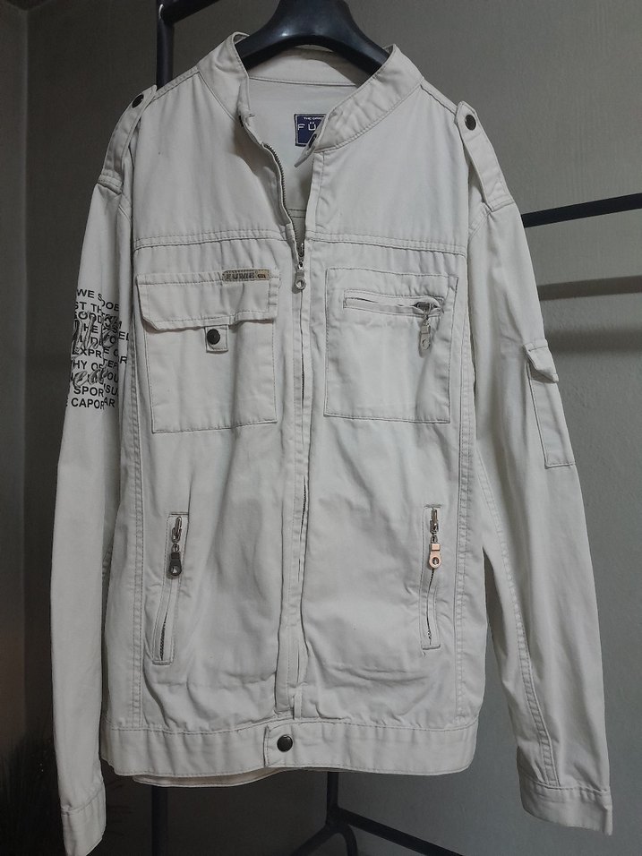 Fermuarlı cepleri ve bol kesimiyle beyaz keten ceket, uzun kollu ve yakası çıtçıtlıdır. Günlük kullanıma uygundur.
