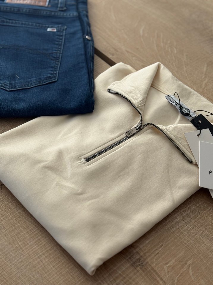 Erkekler için fermuarlı ön kısmı ve yakalı tasarımı olan uzun kollu sweatshirt. Yumuşak kumaştan üretilmiş, rahat kesim ve sade krem renkte günlük kullanıma uygun bir model.