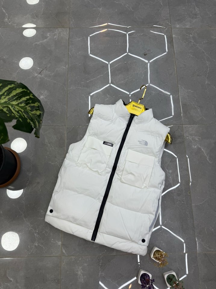 Erkekler için beyaz, fermuarlı, kolsuz yelek. Yaka detaylı ve sıcak tutan kumaştan, günlük dış mekan kullanımı için uygundur. Desensiz ve normal boydadır.