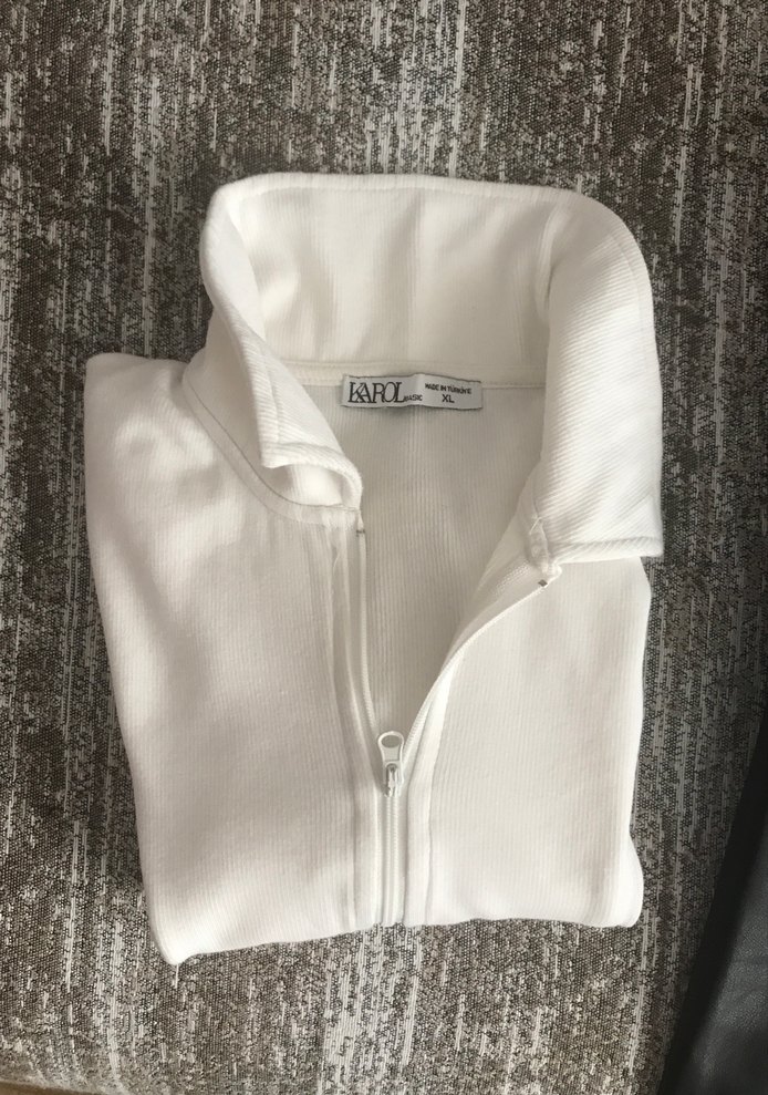 Fermuarlı önü ve yüksek yakası olan erkek beyaz, vücuda oturan sweatshirt. Desensiz, uzun kollu, günlük rahatlığa uygun sokak stili parçası.